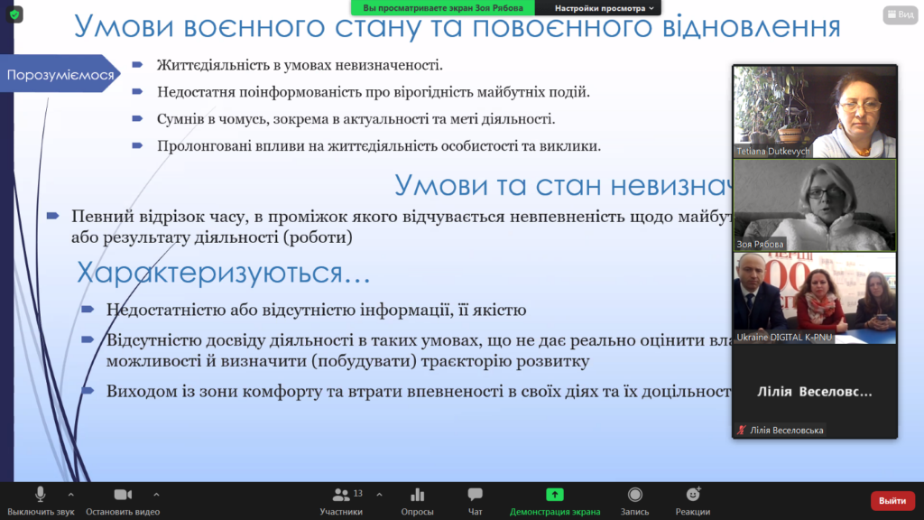 11 жовтня студенти 2,3 та 4 курсів ОПП “Практична психологія прослухали гостьову лекцію доктора педагогічних наук, професора, завідувача кафедри менеджменту освіти і права Державного закладу вищої освіти «Університет менеджменту освіти» НАПН України» (м. Київ) Зої Рябової на тему «Адаптивне управління закладом освіти в умовах воєнного стану та повоєнного відновлення».