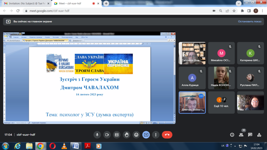 14 лютого 2023 року відбулась зустріч студентів ОПП Практична психологія з Героєм України Дмитром Чавалахом. Тема зустрічі: “Психолог у ЗСУ (думка експерта)”. Пан Дмитро поділився своїми думками про роль психолога у підтриманні психічного благополуччя й у подоланні психоемоційних криз військовослужбовців, а також окреслив основні труднощі й проблеми у діяльності психолога ЗСУ. Студенти мали нагоду почути від пана Дмитра відповіді на свої питання. Зустріч залишила глибокі враження в її учасників.  Щиро дякуємо пану Дмитрові за цікаве і важливе спілкування!