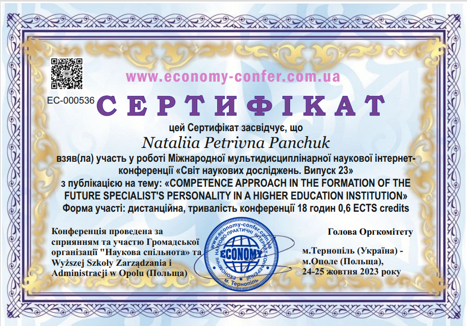 Доцент Панчук Н.П. взяла участь у роботі Міжнародної мультидисциплінарної наукової інтернет-конференції (м. Тернопіль, Україна, м. Ополе, Польща, 24-25 жовтня 2023 р.) на тему: «Світ наукових досліджень». Конференція проведена за сприянням та при активній участі Громадської організації «Наукова спільнота» та Wyższej Szkoły Zarzdzania w Opolu (Польща).