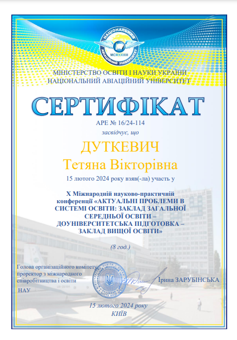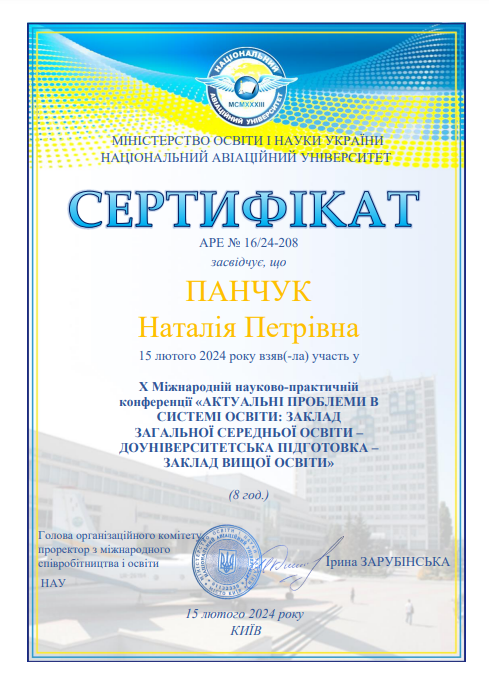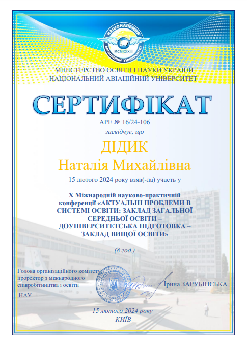15 лютого 2024 р. професор, завідувач кафедри та доценти Дідик Н.М., Панчук Н.П. та Савіцька О.В. взяли участь у роботі Х міжнародної науково-практичної конференції «АКТУАЛЬНІ ПРОБЛЕМИ В СИСТЕМІ ОСВІТИ: ЗАКЛАД ЗАГАЛЬНОЇ СЕРЕДНЬОЇ ОСВІТИ – ДОУНІВЕРСИТЕТСЬКА ПІДГОТОВКА – ЗАКЛАД ВИЩОЇ ОСВІТИ», зорганізованої Національним авіаційним університетом (м.Київ). Під час роботи конференції в процесі жвавого обговорення відбувся обмін досвідом, передовими освітніми технологіями, презентація освітніх проєктів; обмін дослідницьким досвідом тощо. Загалом участь у конференції дозволила презентувати науковій спільноті України та зарубіжжя наукові надбання кафедри та познайомитися з творчим підходом до вирішення актуальних проблем сучасної освіти представниками різних країн світу у галузі освіти.