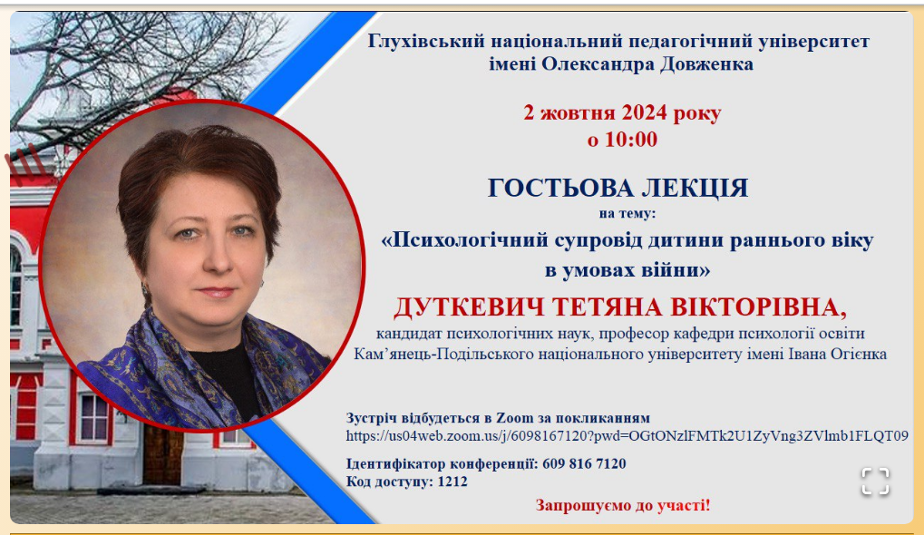 02 жовтня 2024 р. професор Т.В.Дуткевич прочитала гостьову лекцію «Психологічний супровід розвитку дитини раннього віку в умовах воєнного стану» у Глухівському національному педагогічному університеті імені Олександра Довженка. Було висвітлено роль для розвитку дитини сімейного спілкування, проаналізовано несприятливі наслідки його руйнування в умовах військових дій; розкрито завдання психологів і педагогів системи дошкільної освіти щодо раннього втручання і психологічного супроводу.