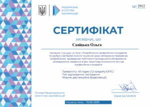 Доцент кафедри Ольга Савіцька у квітні 2025 р. успішно завершила навчання на програмою “Розроблення професійних стандартів”, зорганізованою Національним агентством кваліфікацій та здобула базові знання і вміння щодо методичних підходів до розроблення, проведення публічного громадського обговорення, затвердження, введення в дію, перегляду та внесення змін до професійних стандартів, що посвідчено сертифікатом.