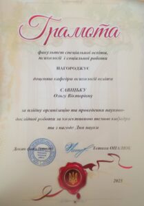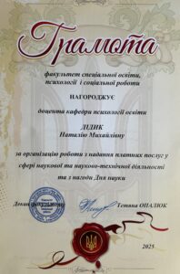 З нагоди Дня науки Грамотами факультету спеціальної освіти, психології та соціальної роботи були відзначені доценти Ольга Савіцька за плідну організацію та проведення науково-дослідної роботи за колективною темою кафедри та Наталія Дідик за організацію роботи з надання платних послуг у сфері наукової та науково-технічної діяльності.