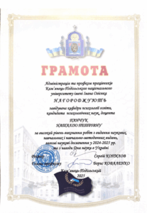 13 травня на засіданні ректорату К-ПНУ ректор Сергій Копилов вручив завідувачу кафедри психології освіти Кам’янець-Подільського національного університету імені Івана Огієнка Панчук Наталії Петрівні грамоту за високий рівень виконання робіт з видання наукових, навчальних і навчально-методичних видань, вагомі наукові досягнення у 2024-2025 рр. та з нагоди Дня науки в Україні.