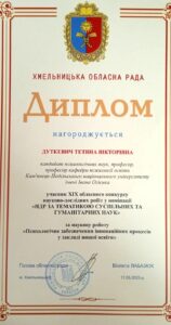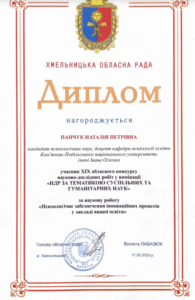 Колектив науково-дослідної лабораторії педагогіки та психології вищої освіти кафедри психології освіти у складі професора Тетяни Дуткевич та доцентів Ольги Савіцької, Наталії Панчук та Наталії Дідик взяв участь у XIX обласному конкурсі науково-дослідних робіт у номінації “НДР за тематикою суспільних та гуманітарних наук”. На конкурс була представлена НДР (у формі монографії) “Психологічне забезпечення інноваційних процесів у закладі вищої освіти”, яка стала підсумком чотирьохрічної роботи над науково-дослідною темою “ПСИХОЛОГІЧНЕ ЗАБЕЗПЕЧЕННЯ ІННОВАЦІЙНИХ ПРОЦЕСІВ У ВИЩІЙ ОСВІТІ” (Реєстраційний номер УкрІНТЕІ 0120U101142, науковий керівник доцент Савіцька О.В.). Авторський колектив нагороджений дипломами Хмельницької обласної ради.