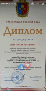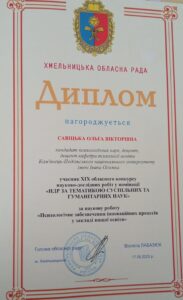 Колектив науково-дослідної лабораторії педагогіки та психології вищої освіти кафедри психології освіти у складі професора Тетяни Дуткевич та доцентів Ольги Савіцької, Наталії Панчук та Наталії Дідик взяв участь у XIX обласному конкурсі науково-дослідних робіт у номінації “НДР за тематикою суспільних та гуманітарних наук”. На конкурс була представлена НДР (у формі монографії) “Психологічне забезпечення інноваційних процесів у закладі вищої освіти”, яка стала підсумком чотирьохрічної роботи над науково-дослідною темою “ПСИХОЛОГІЧНЕ ЗАБЕЗПЕЧЕННЯ ІННОВАЦІЙНИХ ПРОЦЕСІВ У ВИЩІЙ ОСВІТІ” (Реєстраційний номер УкрІНТЕІ 0120U101142, науковий керівник доцент Савіцька О.В.). Авторський колектив нагороджений дипломами Хмельницької обласної ради.